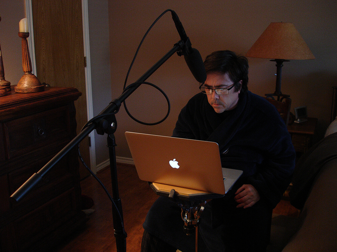 Of late (and when not working on ≈9x times videos and graphics) I've been putting in many long hours on the upcoming A CATCH IN TIME video/reading project. Finally decided I had to ADR one short sentence that I had read without practice or direction, but finally figured out the proper delivery. Shwooo! Sounds pretty good now and I no longer have a need to vomit blood every time I hear the terribly performed line come out of my mouth. :D Anyway...enjoy the pics, my wrinkly oldman look in Hugh Hefner robe (Black CAB Productions dress code) and the fact that my drummer practice-pad makes an outstanding laptop stand.